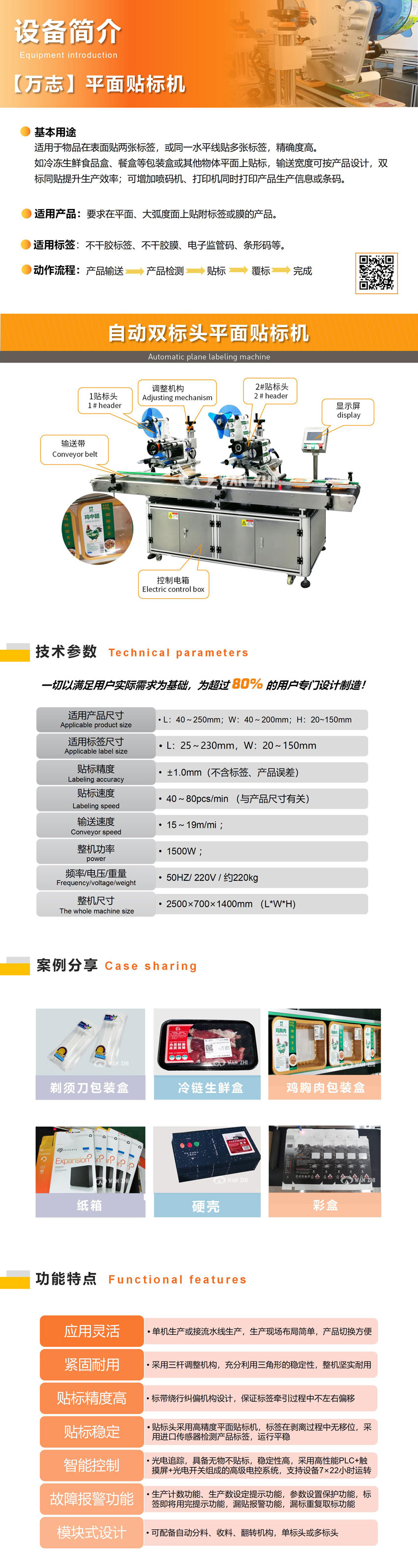 自動雙標頭平面貼標機適用于物品在上表面貼兩張標簽,或同一水平線貼多張標簽,精確度高。如冷凍生鮮食品盒、餐盒、水果盒等包裝盒上貼標 ,提升生產效率。