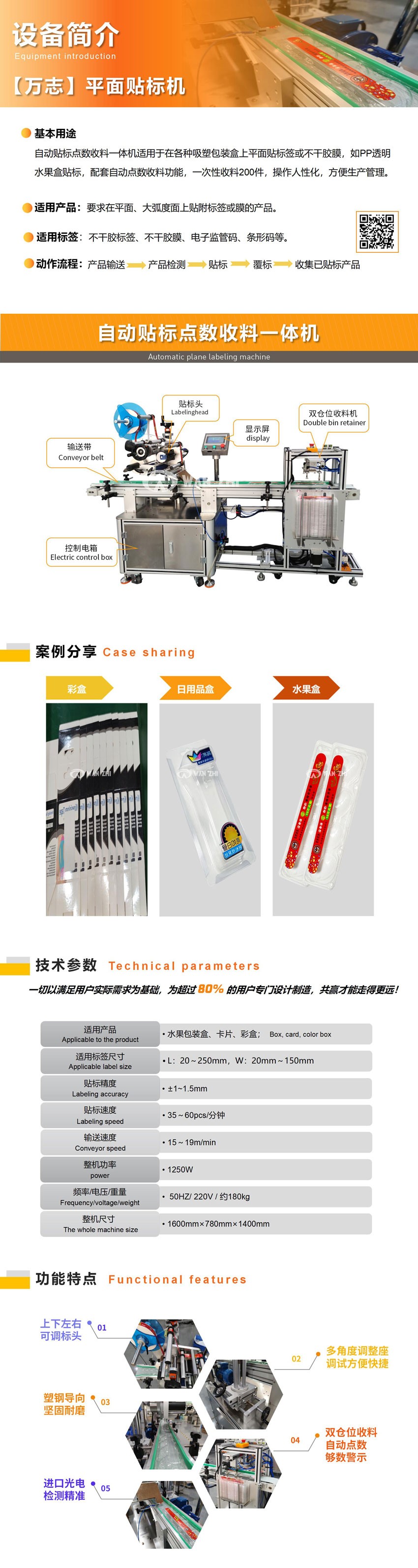 適用于在各種吸塑包裝盒上平面貼標簽或不干膠膜,如PP透明水果盒貼標,配套自動點數收料功能,一次性收料200件,操作人性化,方便生產管理。