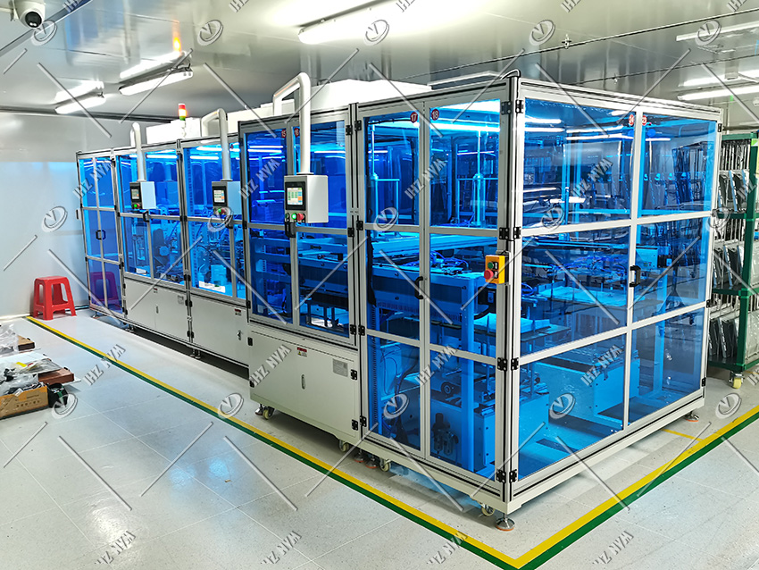 LED反射片貼標及壓合折邊機投放于無塵車間使用,設備采用ffu過濾設備,使外氣先通過MAU(外氣進行首次過濾)進入無塵室頂部,再通過FFU(二次過濾)將風送進無塵室內,送下來的風通過高架地板,再進入回風箱送到無塵室頂部, 風速調節靈活,潔凈區易于變更;