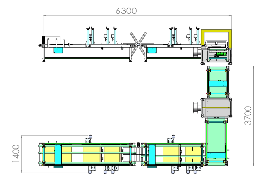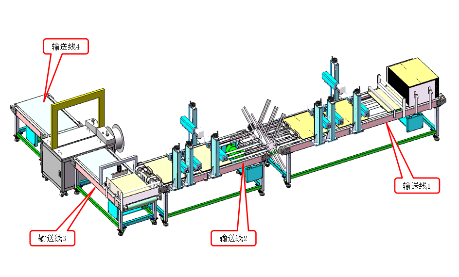 7.折疊好的產品流入打包機,打包機將產品進行打包扎帶,兩條扎帶打包完成后產品繼續流入下一工位以上為完整作業流程,產線按此循環動作