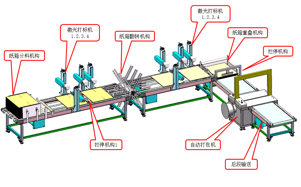 4.產品翻轉至另外一面后產品繼續流入下一工位進行定位打碼,檢測產品到位后氣缸進行攔停,前端兩個激光打碼機將碼數打入紙箱指定位置