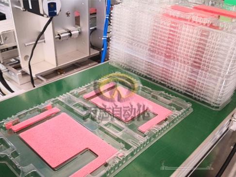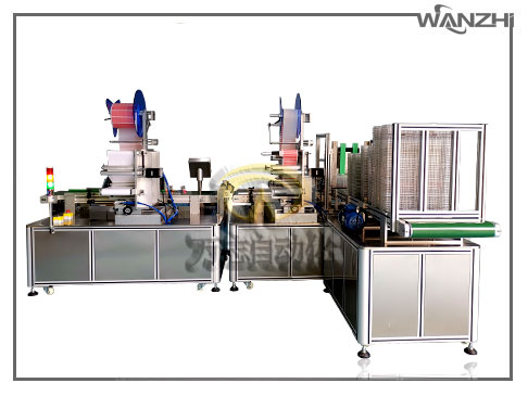 啟動自動—>輸送啟動—>將產品放在輸送上(或連接前端生產線) —>測物傳感器檢測到產品—>攔停產品—>牽引電機啟動出標—>海綿條貼覆在產品上—>貼標完成—>攔停定位氣缸退回—>輸送啟動—>攔停產品—>2#標頭貼海綿—>自動收料—>推出推疊產品到緩存輸送帶。